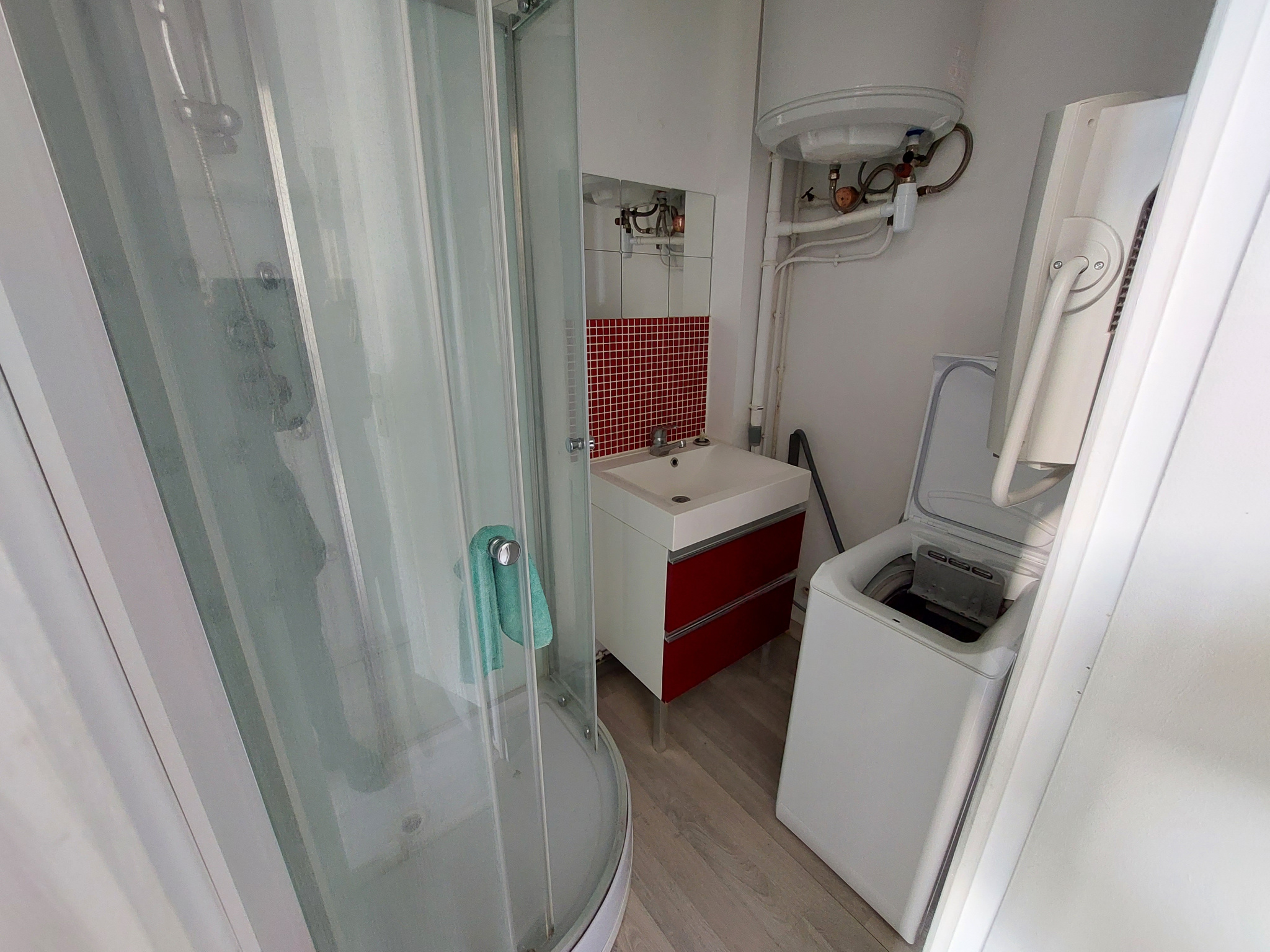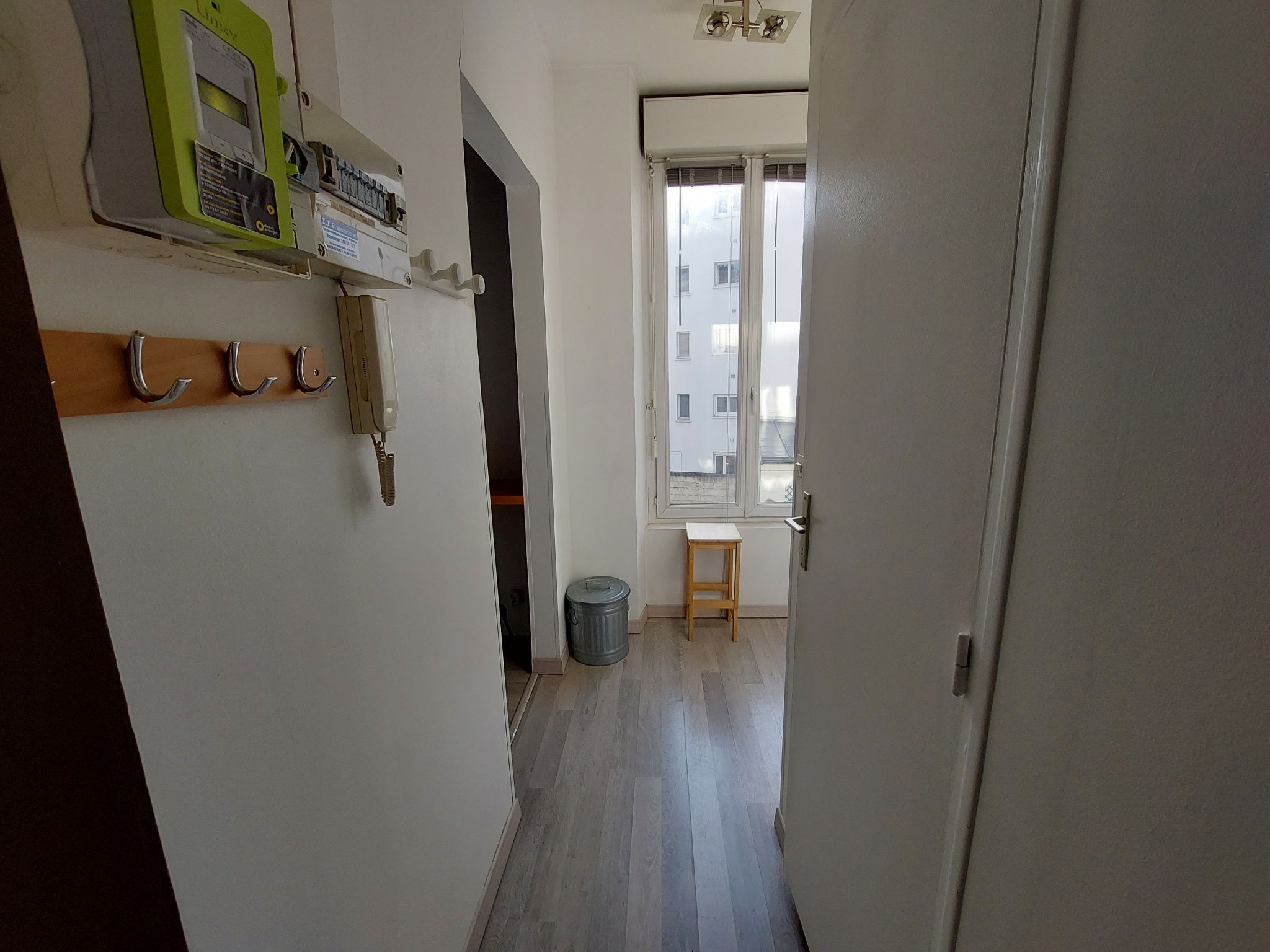 une belle entrée de 4 m2, un séjour très lumineux, avec cuisine ouverte et équipée, d'une machine à laver, d'une plaque de cuisson, d'un four, d'un micro ondes, et d'un réfrigérateur, le tout sur 24.35 m2, une chambre de 12.84 m2, une salle de bains avec WC et un grand débarras.