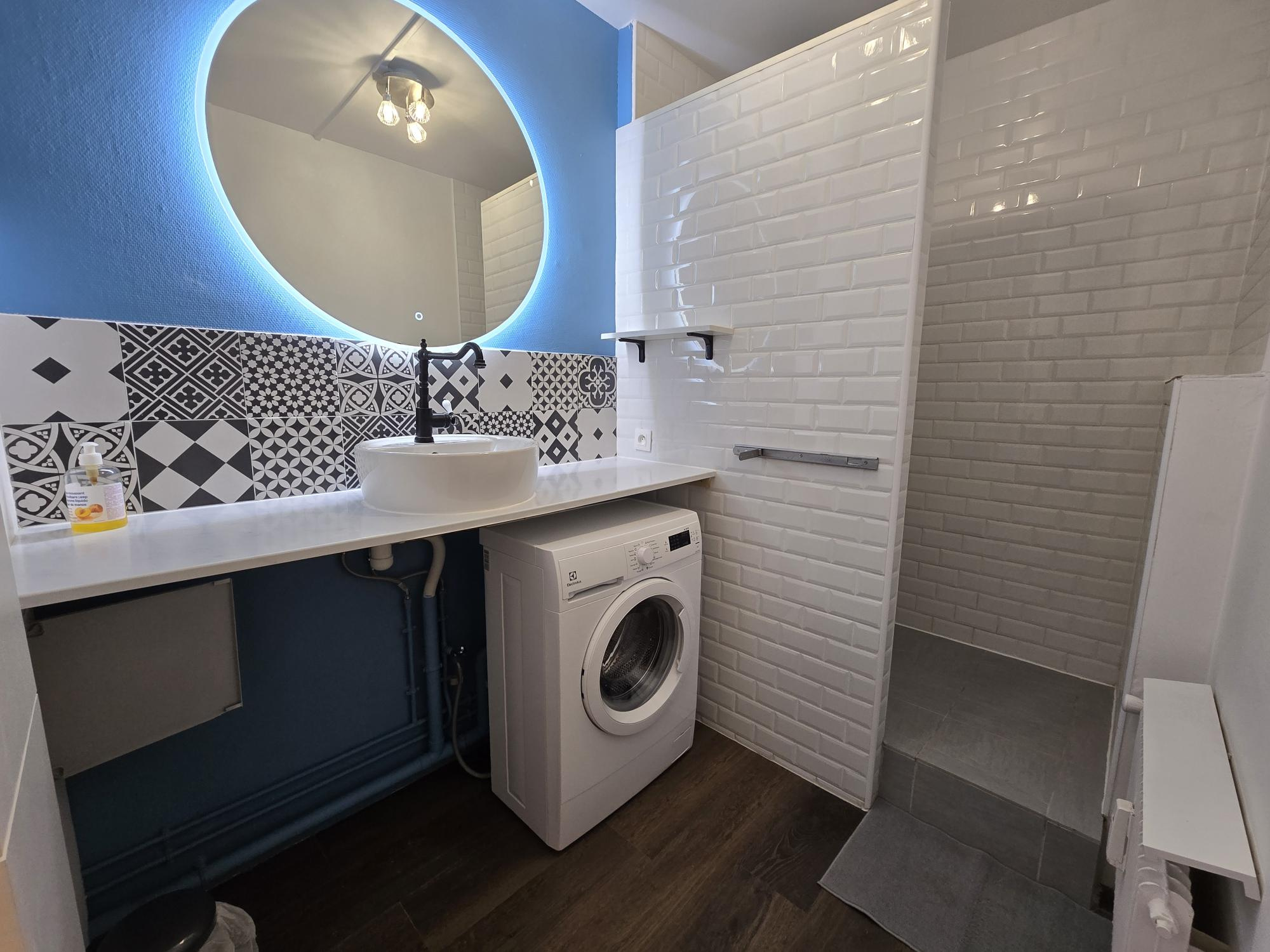 Appartement composé comme suit : entrée avec débarras, pièce de vie avec cuisine ouverte équipée (le tout sur 24 m2), chambre (11.30 m2), salle d'eau et WC indépendant. Le bien dispose également d'une cave en sous-sol et d'une place de parking aérienne.